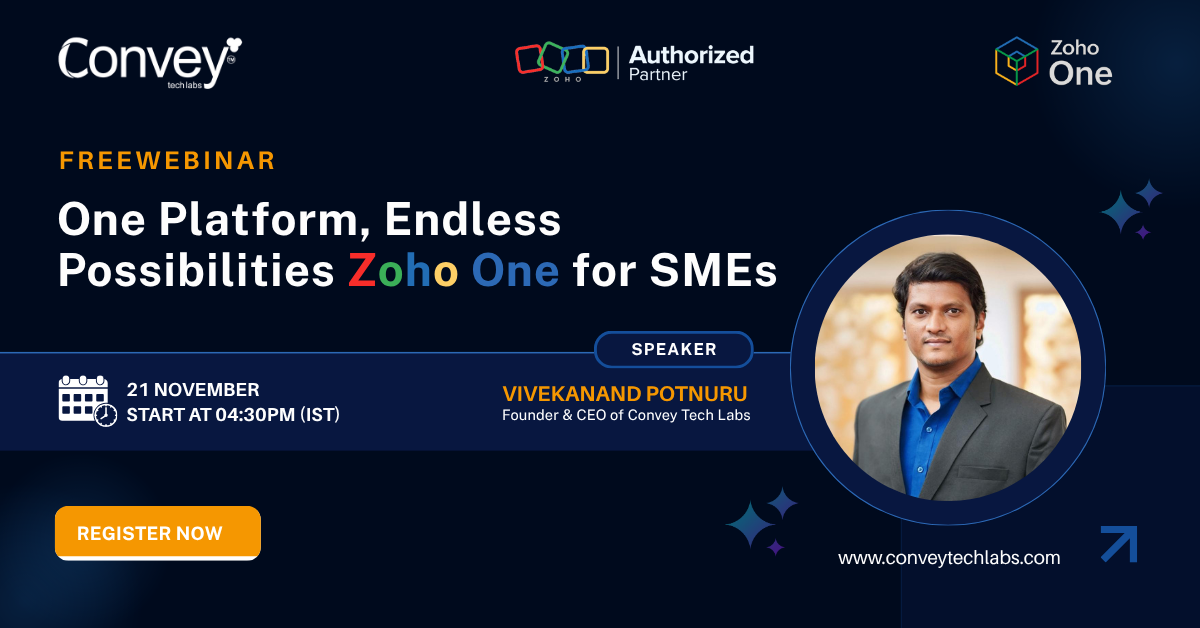 Convey Tech Labs is a trusted Zoho Authorized Partner specializing in Zoho One and Zoho CRM solutions. We help businesses streamline operations through expert implementation, integration, and automation. Our goal is to simplify processes, boost productivity, and drive growth with tailored Zoho solutions designed for long-term success.